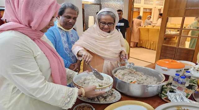 ভিডিওতে দেখা যায়, বঙ্গবন্ধুকন্যা শেখ হাসিনা স্বজনদের মাঝে ইলিশ-পোলাও পরিবেশন করছেন। গরম ভাপ ওঠা ইলিশের টুকরো যাতে ভেঙে না যায়, সেজন্য তিনি একটি একটি করে পাতে তুলে দিচ্ছেন।