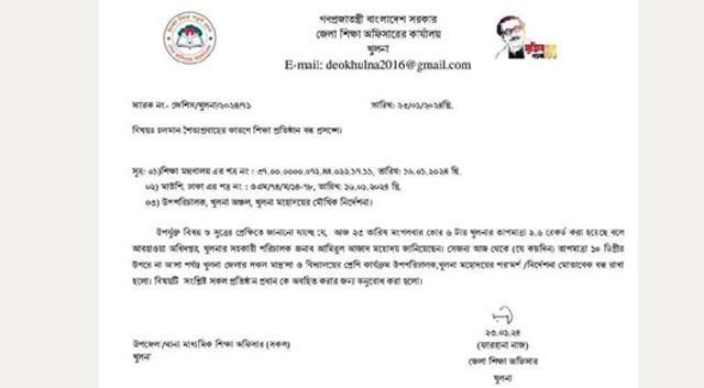 মঙ্গলবার (২৩ জানুয়ারি) সকালে খুলনা জেলা প্রাথমিক শিক্ষা কর্মকর্তা মো. অহিদুল ইসলাম ও মাধ্যমিক শিক্ষা কর্মকর্তা পৃথক দুটি চিঠিতে এই নির্দেশনা দেন। অবশ্য নির্দেশনা পৌঁছানোর আগেই অনেক বিদ্যালয় ক্লাস শুরু হয়েছে।