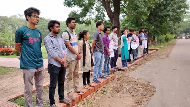 বুধবার (২৯ মে) দুপুর দেড়টায় বিশ্ববিদ্যালয়ের কেন্দ্রীয় শহীদ মিনারের সামনের সড়কে এ মানববন্ধন অনুষ্ঠিত হয়।