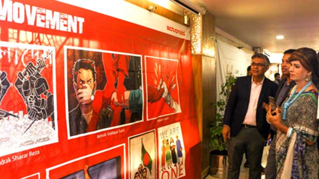 সংলাপ শেষে ছাত্র-জনতার গণঅভ্যুত্থানকে কেন্দ্র করে বিশেষ কার্টুন ও শিল্প-কর্ম প্রদর্শনী ঘুরে দেখেন আমন্ত্রিত অতিথিরা।