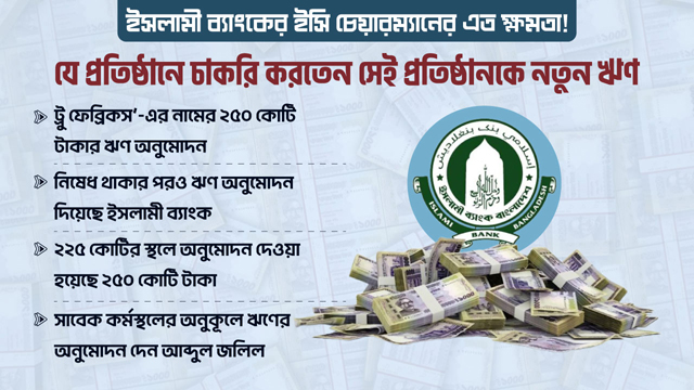 বাংলাদেশ ব্যাংকের নিষেধাজ্ঞা অমান্য করে নতুন ঋণ অনুমোদন করেছে ইসলামী ব্যাংক। ট্রু ফেব্রিকস লিমিটেড নামের এক প্রতিষ্ঠানের অনূকুলে ২৫০ কোটি টাকার এই ঋণ অনুমোদন করা হয়। সম্প্রতি ব্যাংকের নির্বাহী কমিটি বড় অংকের এই ঋণটি অনুমোদন দেয়। বাংলাদেশ ব্যাংক ও ইসলামী ব্যাংকের ঋণ অনুমোদন সংক্রান্ত নথিতে চাঞ্চল্যকর এই ঘটনা উঠে আসে।